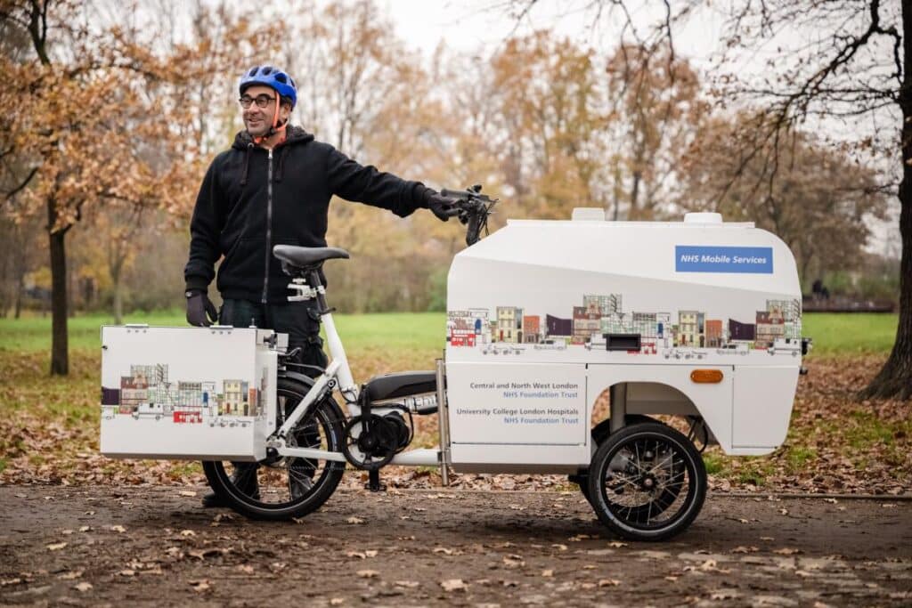 Mit dem von Velofracht aus Berlin umgebauten Rad erreichen die Mitarbeiter des britischen NHS Bereiche, die mit einem Auto oder Krankenwagen sonst nicht gut zu erreichen sind, wie z.B. Parks, Obdachlosenunterkünfte, Suppenküchen oder Plätze unter Brücken.